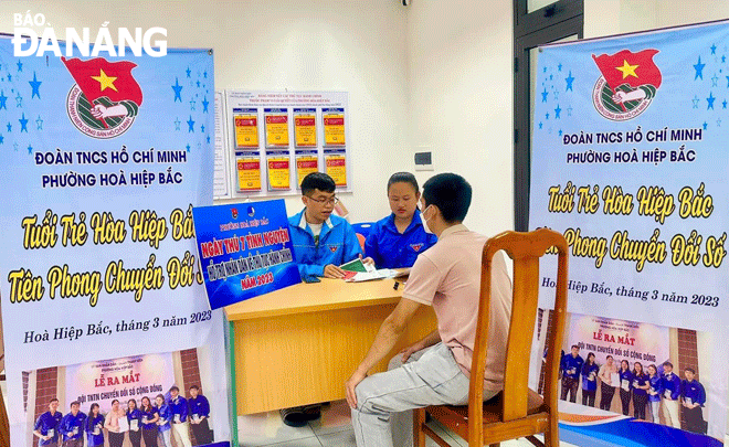 Đoàn viên thanh niên UBND phường Hòa Hiệp Bắc (quận Liên Chiểu) hỗ trợ người dân thông tin về chuyển đổi số. Ảnh: M.Q
