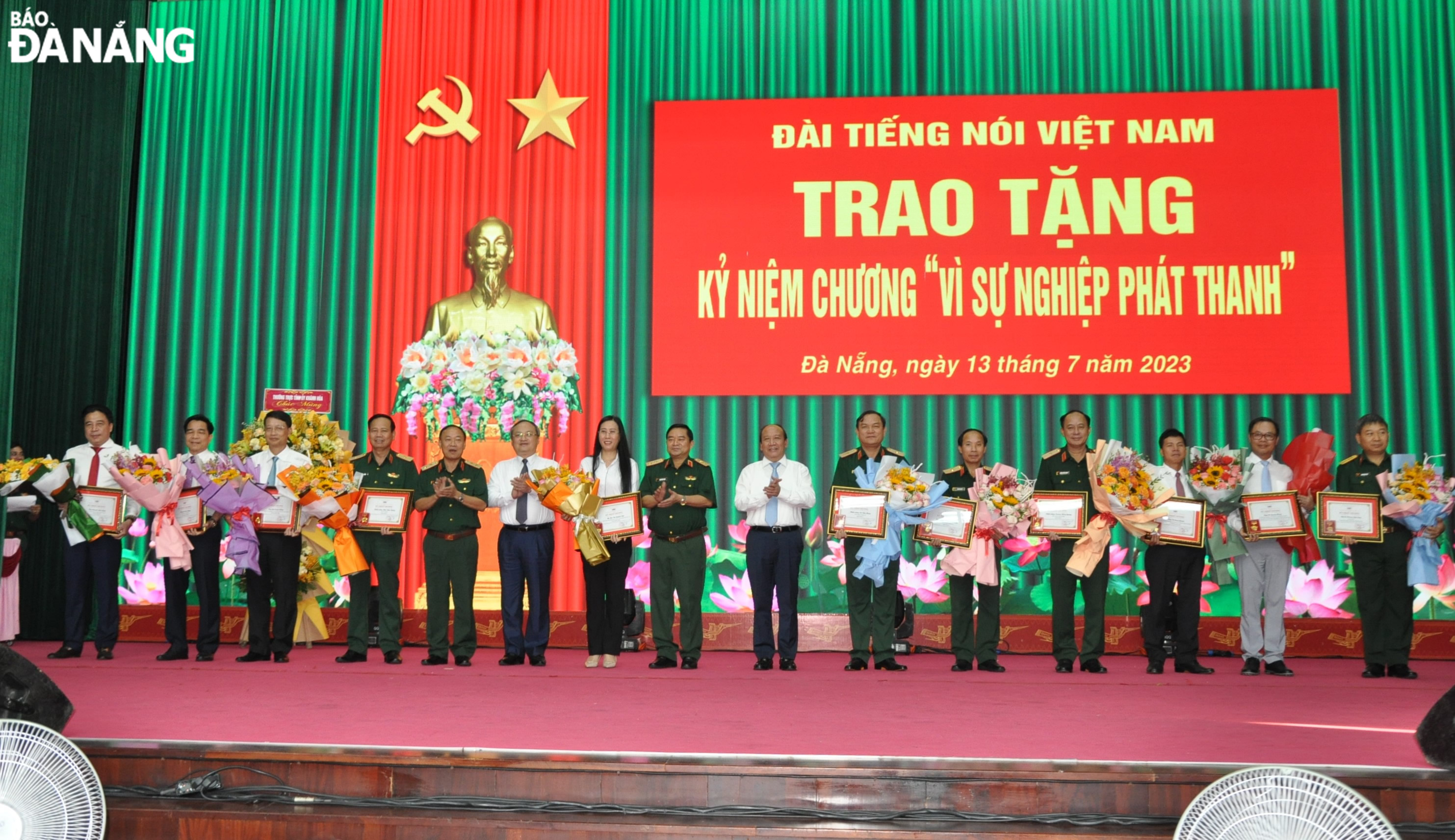 Lãnh đạo VOV và thủ trưởng Quân khu 5 trao tặng kỷ niệm chương “Vì sự nghiệp phát thanh” và hoa cho các cá nhân là lãnh đạo các địa phương và các tướng lĩnh Quân khu 5. Ảnh: LÊ HÙNG