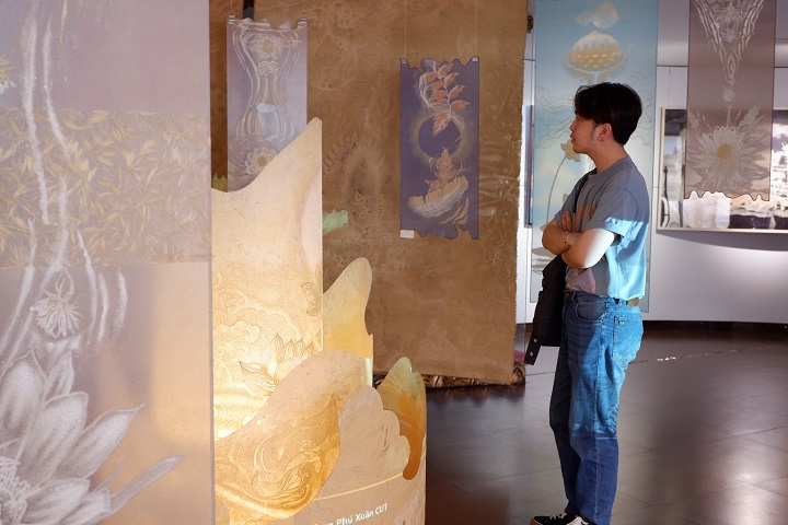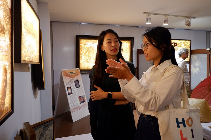 Đến buổi triển lãm từ rất sớm, Chị Phan Bảo Duyên, quận Thanh Khê (bên phải) bày tỏ niềm vui và ấn tượng với các tác phẩm nghệ thuật Trúc chỉ. "Qua buổi triển lãm, mình hiểu hơn về nét đẹp giao thoa giữa truyền thống và hiện đại. Từ những nguyên liệu mộc mạc qua bàn tay khéo léo của các nghệ nhân đã tạo nên các tác phẩm đầy sống động. Mỗi một nguyên liệu đều mang một màu sắc riêng, chất riêng, rất đặc biệt. Giờ đây, giấy không chỉ là "nền" mà chính nó cũng có câu chuyện riêng của mình", chị Duyên chia sẻ.