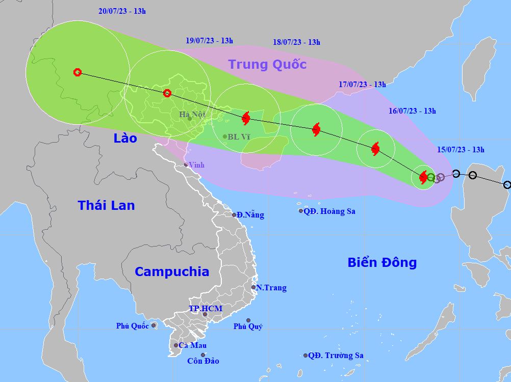 Trong 48 giờ tới, bão tiếp tục di chuyển theo hướng tây tây bắc với tốc độ 10-15km/giờ. Đến 13 giờ ngày 17-7, dự kiến tâm bão tại ở khoảng 20,5 độ vĩ bắc, 112,5 độ kinh đông, với sức gió mạnh cấp 11-12, giật cấp 15.